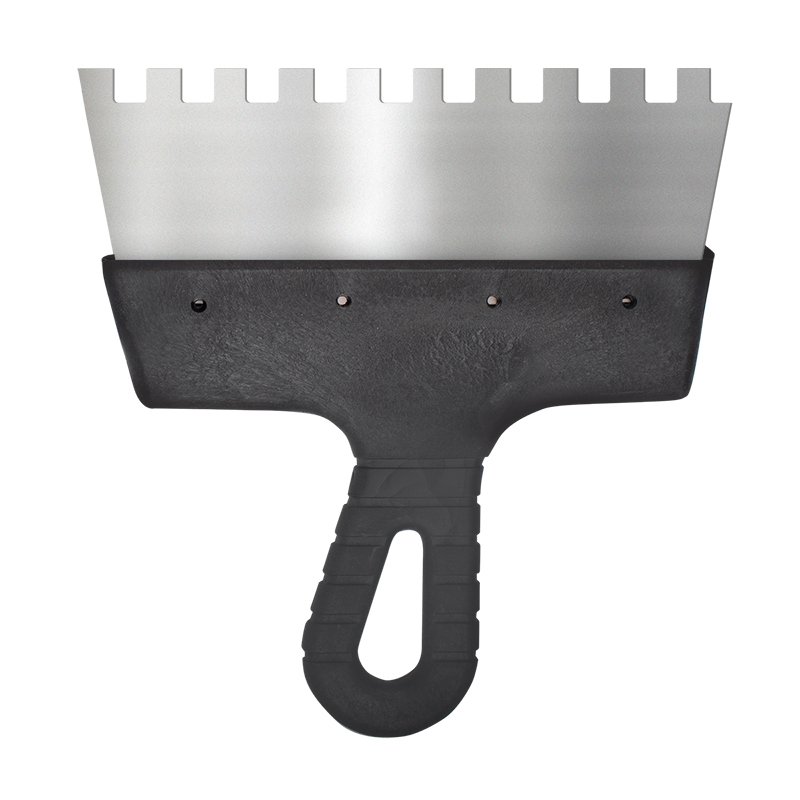 Предназначен для нанесения и выравнивания строительных смесей. Зубчатое полотно из нержавеющей стали. Рукоятка из пластмассы.