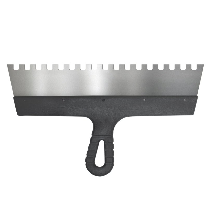 Предназначен для нанесения и выравнивания строительных смесей. Зубчатое полотно из нержавеющей стали. Рукоятка из пластмассы.