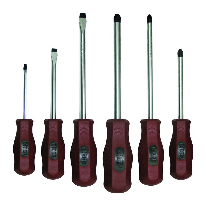 Предназначен для монтажа шлицевого крепежа. Хромованадиевая сталь повышенной твердости. Эргономичная обрезиненная противоскользящая рукоятка. Магнитный наконечник. Набор из 6 отверток: плоский шлиц - 3х75, 5х100, 6х150, крестовой шлиц - #1х100, #2х150, #3х150.