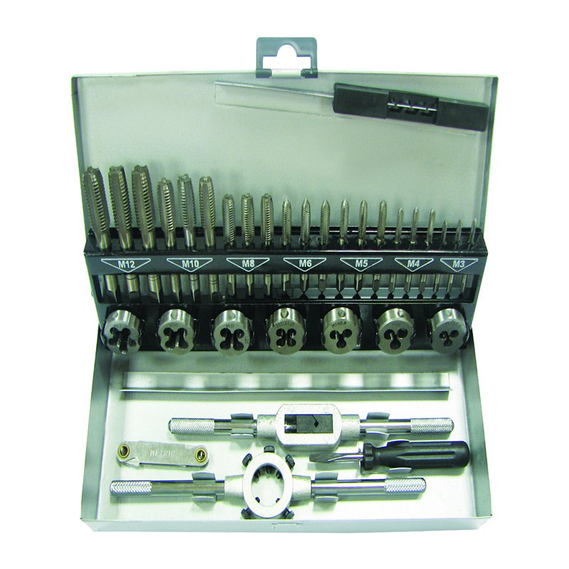 Предназначены для нарезания наружной и внутренней метрической резьбы. Легированная сталь. Метчики: черновой, средний, чистовой для каждого размера, плашки: М3х0,5; М4х0,7; М5х0,8; М6х1,0; М8х1,25; М10х1,5; М12х1,75; вороток; плашкодержатель; отвертка; шаблон для определения шага резьбы.