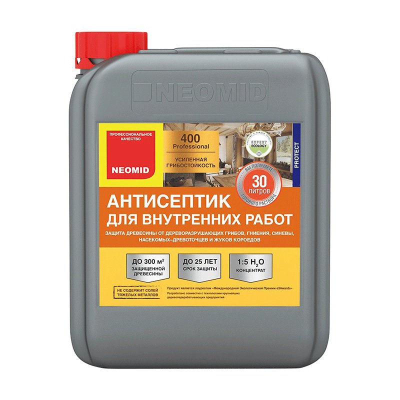 Деревозащитное средство нового поколения на водной основе для внутренних работ. Предназначено для защиты древесины на срок до 25 лет от гниения, от действия дереворазрушающих и деревоокрашивающих плесневых грибов, насекомых-древоточцев и короедов. Способно как предотвращать биопоражение, так и останавливать уже начавшиеся процессы разрушения древесины биологическими агентами. Может применяться как антисептический грунт под покраску Neomid Biocolor. Не изменяет структуру древесины, не препятствует дальнейшей обработке, склеиванию и окраске. Расход готового раствора: 100-250 г/м².