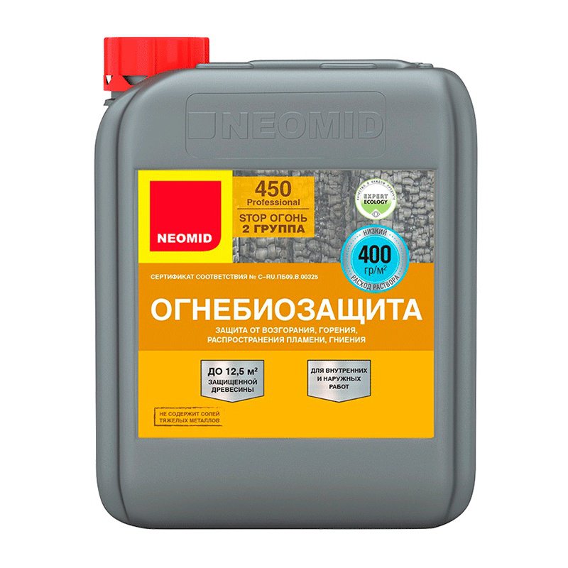 Высокоэффективный состав для огнезащиты и антисептирования древесины. Применяется как защитная и антисептическая пропитка. Переводит древесину в трудновоспламеняемый материал, обеспечивая II (вторую) группу огнезащитной эффективности согласно НПБ 251-98. Подходит для следующих объектов: деревянные стены балок, стропильные системы, несущие брусья, перекрытия, лаги, оконные и дверные блоки, а также другие конструкции из древесины различного назначения. Расход: 400 г/м². Время высыхания: не менее 48 часов при температуре 16-20°С и относительной влажности воздуха 60%.