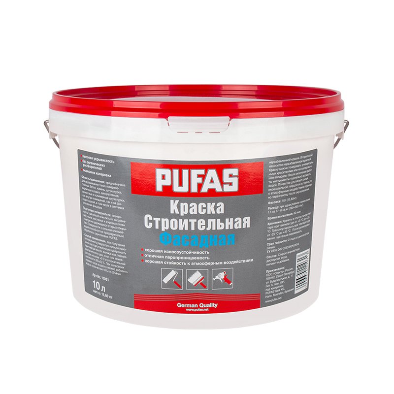 Атмосферостойкая акрилатная (акриловая) латексная краска для окраски фасадов, а также стен и потолков внутри любых помещений. Применяется для качественной окраски любых фасадов, за исключением известковых. Расход: 8 м2/л (200 г/м2) - на однослойное покрытие, 4 л/м2 – при двухслойном покрытии. Время высыхания межслойное/полное: 60 мин/24 часа.