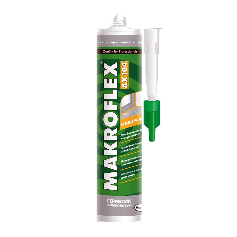 Makroflex® AX104 представляет собой универсальный силиконовый герметик, затвердевающий под воздействием влажности воздуха. Использовать при температуре не ниже +5 °C. Свойства: прекрасная адгезия к эмали, стеклу, керамике, дереву, металлу, окрашенным поверхностям; водонепроницаем; эластичен; устойчив к атмосферным воздействиям; устойчив к воздействию химикатов; система кислотная (ацетокси). Области применения: для внутренних и наружных работ по герметизации везде, где необходима устойчивость к различным атмосферным и химическим воздействиям, а так же там, где соединенные конструкции или детали могут смещаться под влиянием температурных или механических воздействий; при работах по остеклению; в машино- и судостроении. Упаковка 290 мл. Срок хранения 18 месяцев. Не рекомендуется применять: на металлических поверхностях, подверженных коррозии, на бетонных, цементных и оштукатуренных поверхностях; на природных камнях.
