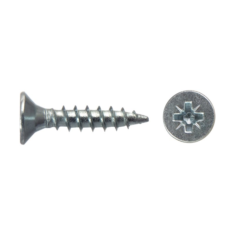 Потайная головка, крестообразный шлиц Pozi, острый наконечник, крупная резьба.