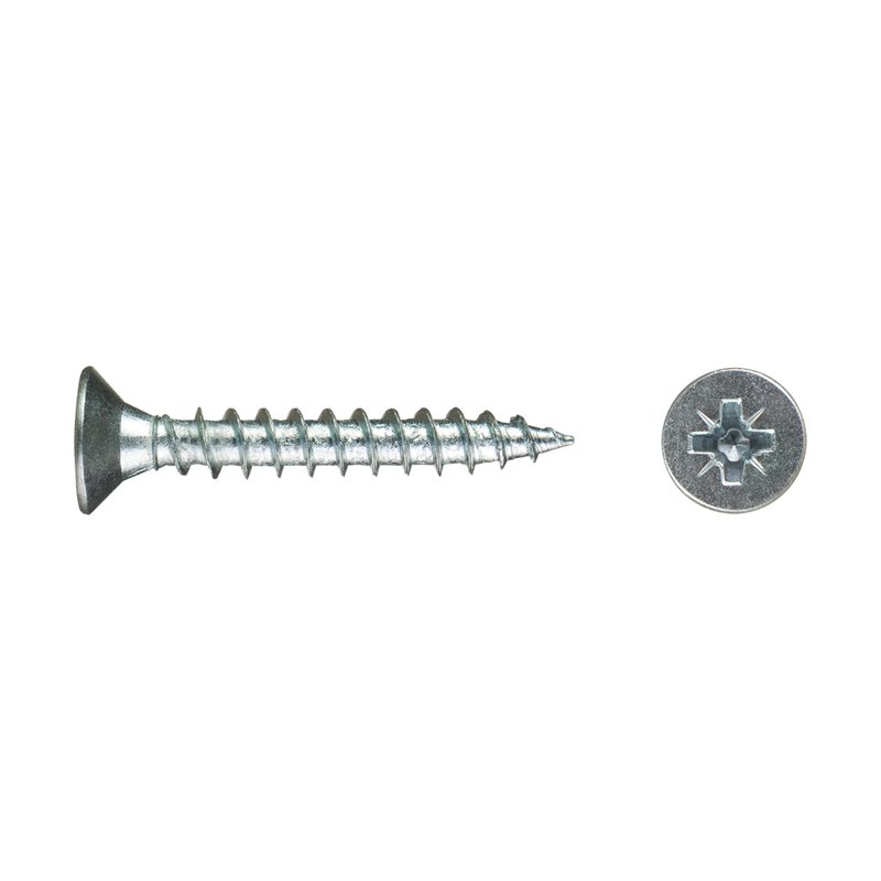 Потайная головка, крестообразный шлиц Pozi, острый наконечник, крупная резьба.