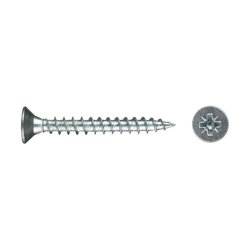 Потайная головка, крестообразный шлиц Pozi, острый наконечник, крупная резьба.