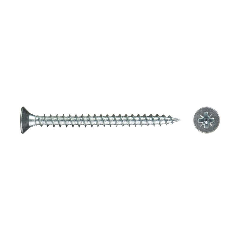 Потайная головка, крестообразный шлиц Pozi, острый наконечник, крупная резьба.
