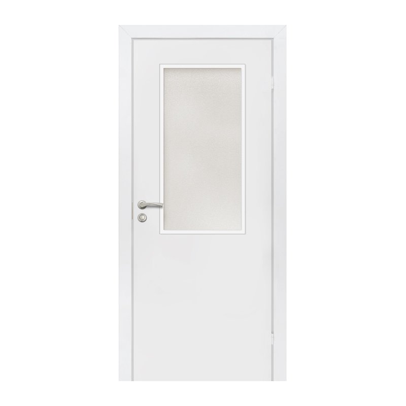 Полотно дверное с притвором остекленное, крашенное. Каркас - массив сосны и(или) МДФ. Сотовое картонное заполнение. Поверхность - плита ХДФ. Окрашено краской УФ-отверждения. Установлен замок модель 2014, установлены 2 резьбовые втулки с винтом для крепления петель. Выполнена фрезеровка 2-х отверстий под ручку и цилиндр (завертку).