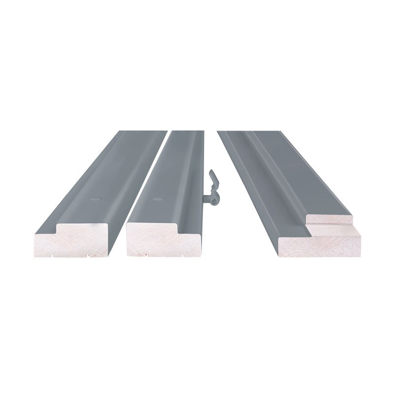 Комплект однопольной дверной коробки состоит из двух стоевых и перекладины, изготовленных из срощенного бруса хвойных пород, сечением 38х85 мм, окрашенного Серой краской УФ отверждения, с 2-я установленными петлями FT-65, ответной планкой замка типа 0068, заглушками для монтажных отверстий.