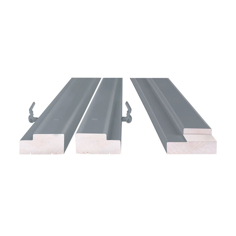 Комплект двупольной дверной коробки состоит из двух стоевых и перекладины, изготовленных из срощенного бруса хвойных пород, сечением 38х85 мм, окрашенного Серой краской УФ отверждения, с 4-я установленными петлями FT-65, заглушками для монтажных отверстий.
