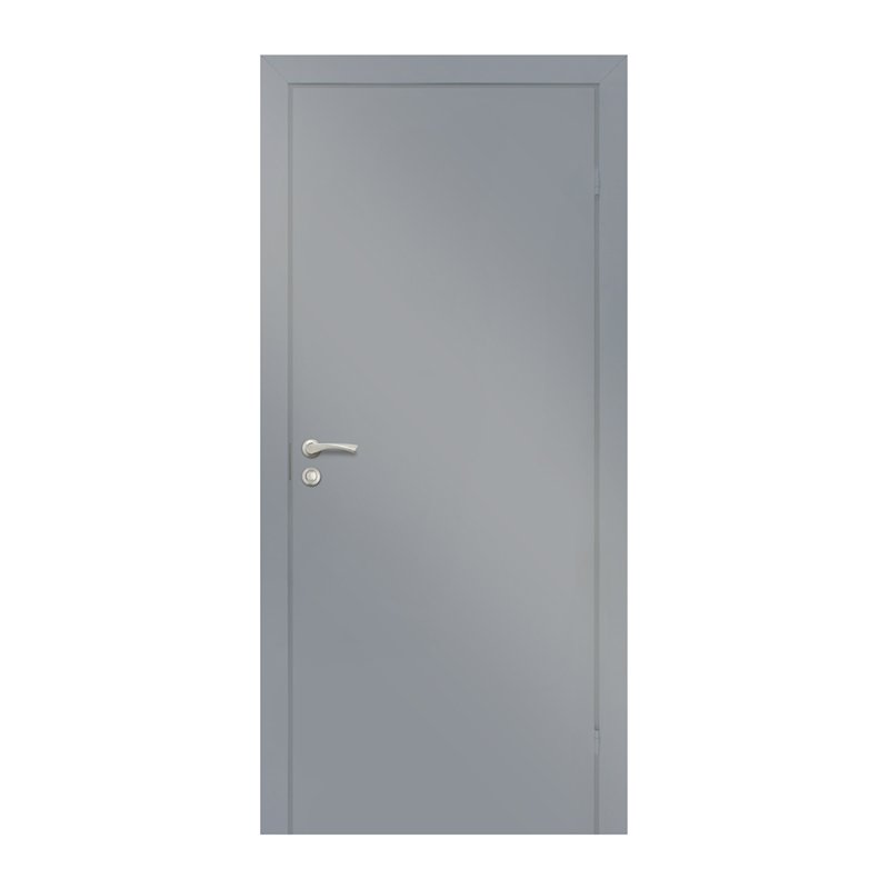 Покрытие - лакокрасочные материалы кислотного отверждения рал 7040. Двери имеют высокую изностойчивость поверхности, менее подвержены механическим воздействиям. Конструкция: Дверное полотно облегчённой конструкции толщиной 40мм, с фальцем: каркас из МДФ, заполнитель - сотовое картонное заполнение, поверхность - HDF плита. Торцевая часть полотна для увеличения прочности покрыта меламиновой плёнкой под цвет полотна, укомплектовано замком 2041.