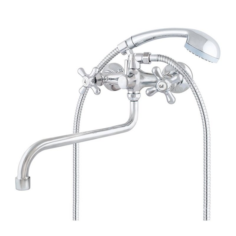 Предназначен для монтажа на стену в ванной комнате. Оснащен округлыми пластиковыми маховиками и трубчатым изливом. Выполнен из цинкового сплава, стойкого к коррозии, давлению и перепаду температур. Кран-буксы выполнены из латуни с металлокерамическими запорными пластинами. S-образный излив выполнен из нержавеющей стали и оснащен качественным аэратором с пластиковым сердечником. Переключатель с излива на душ шарового типа.