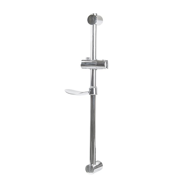 Выполнена из нержавеющей стали и ударопрочного пластика. В комплектацию входят: стойка, комплект держателей стойки, держатель для лейки с кнопочным фиксатором, мыльница, комплект крепежа.