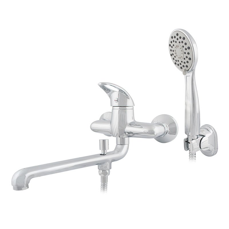 Комплектация: смеситель, металлизированный шланг для душа 1.5 м, душевая лейка (диаметр 82 мм) 3 режима, пластиковый держатель для лейки, комплект крепежа, эксцентрики, декоративные накладки, паспорт изделия.