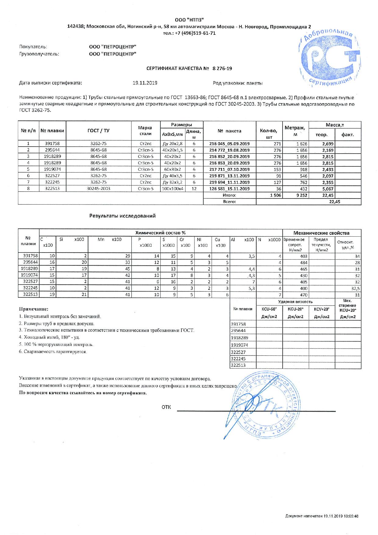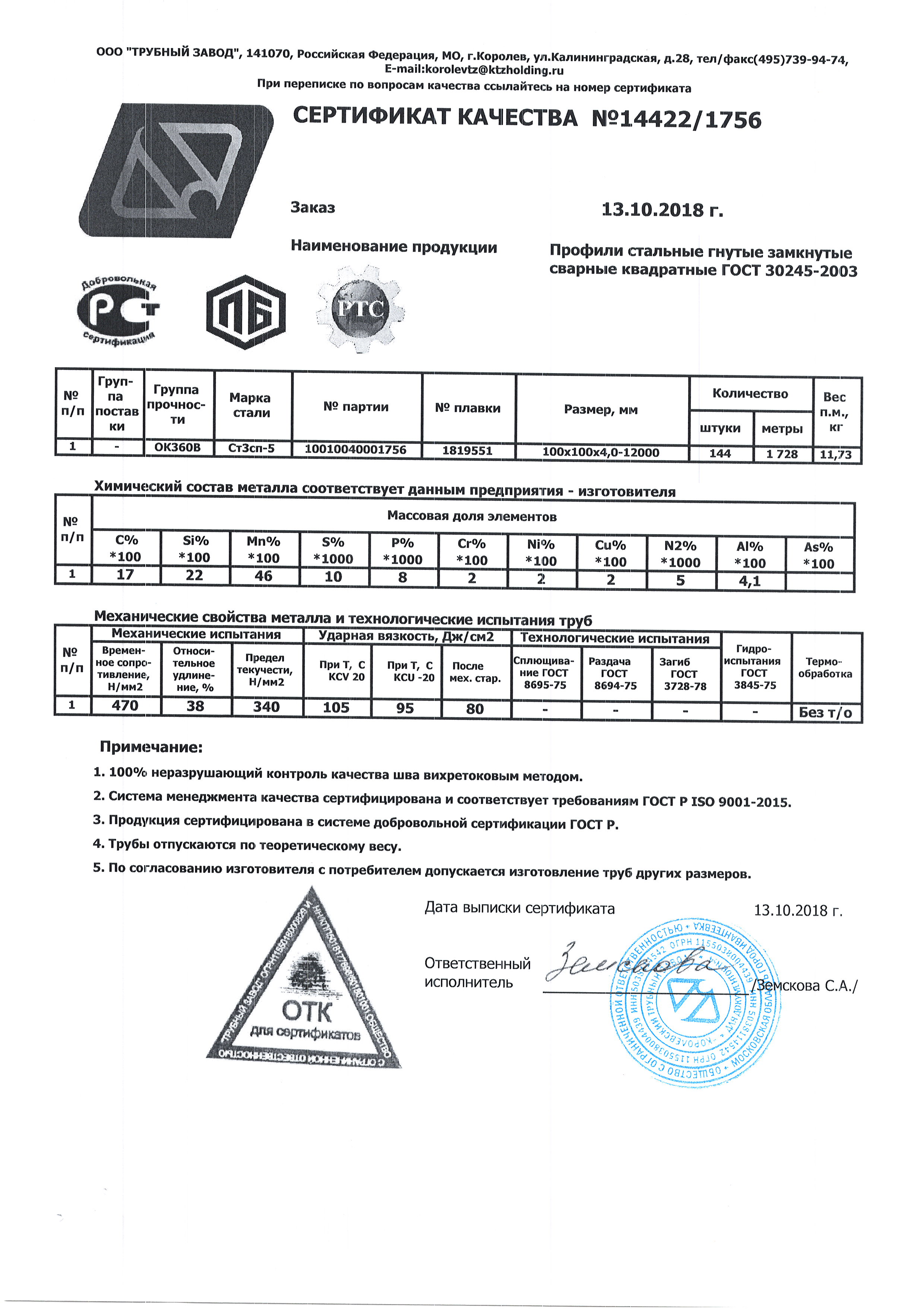 Допустимое отклонение в длине +/- 50мм, предельное отклонение толщины стенки от -25% до +12,5%