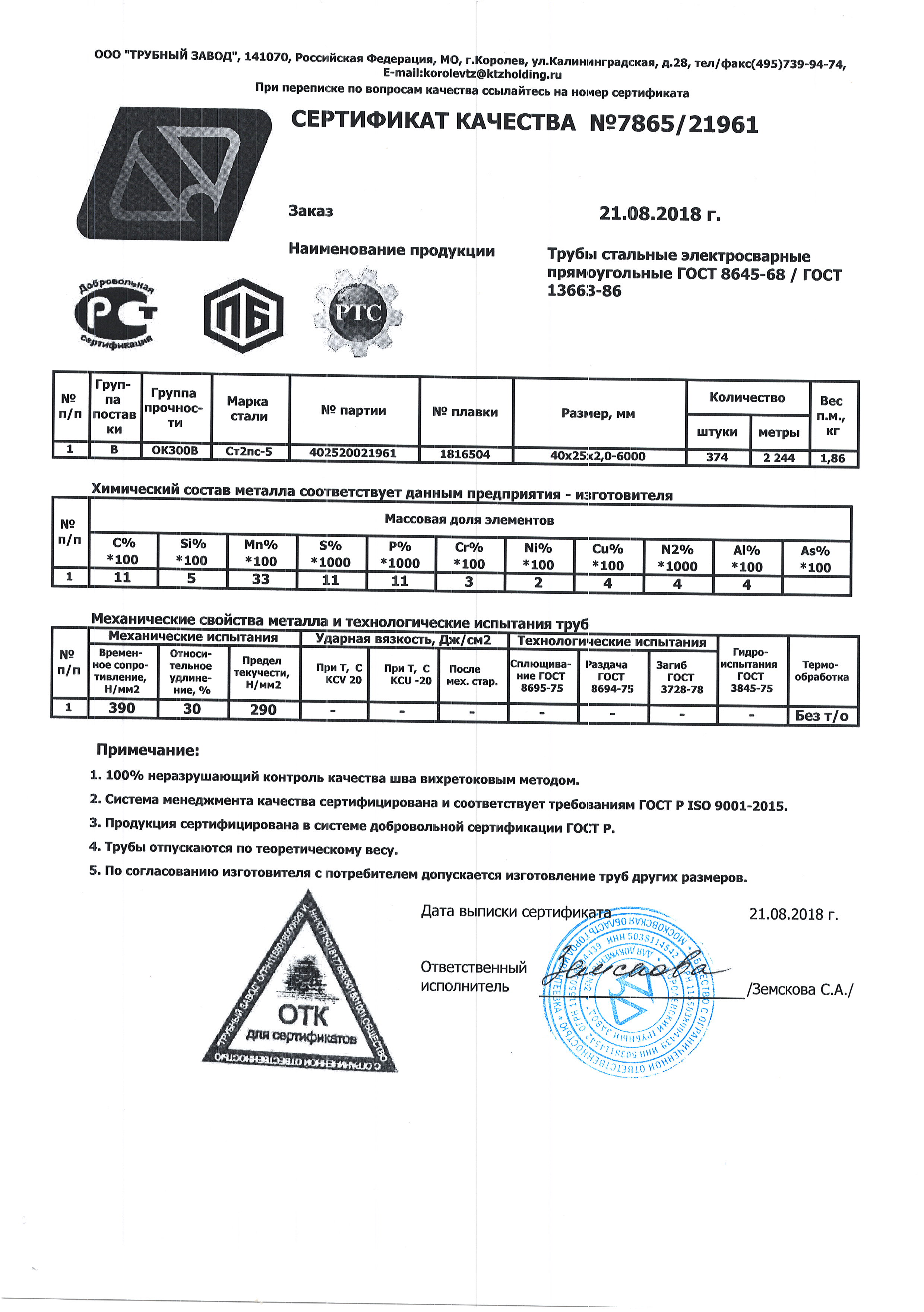 Допустимое отклонение в длине +/- 50мм, предельное отклонение толщины стенки от -25% до +12,5%
