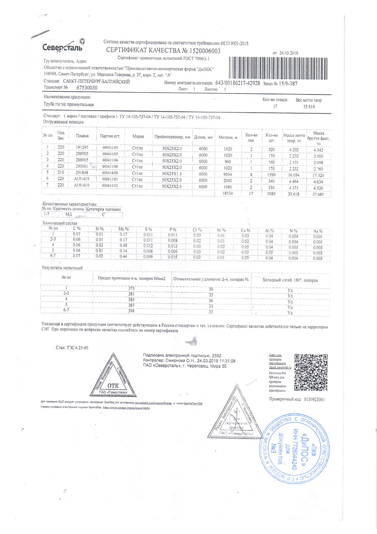 Допустимое отклонение в длине +/- 50мм, предельное отклонение толщины стенки от -25% до +12,5%