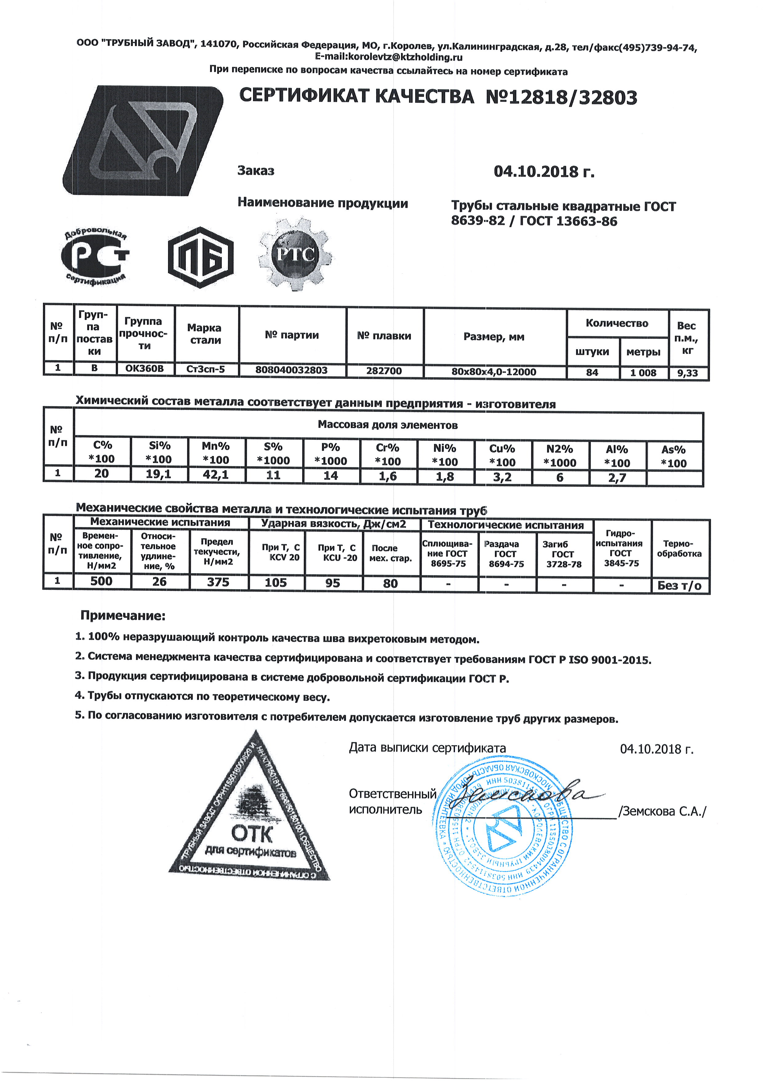 Допустимое отклонение в длине +/- 50мм, предельное отклонение толщины стенки от -25% до +12,5%