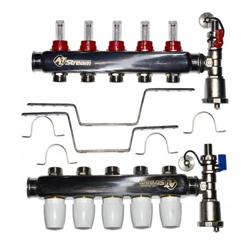 Группа коллект. 1"х3/4" 5вых. в сборе (расходомеры, дрен. кран, авт. возд. отв) 90гр, 8бар, нерж. сталь
