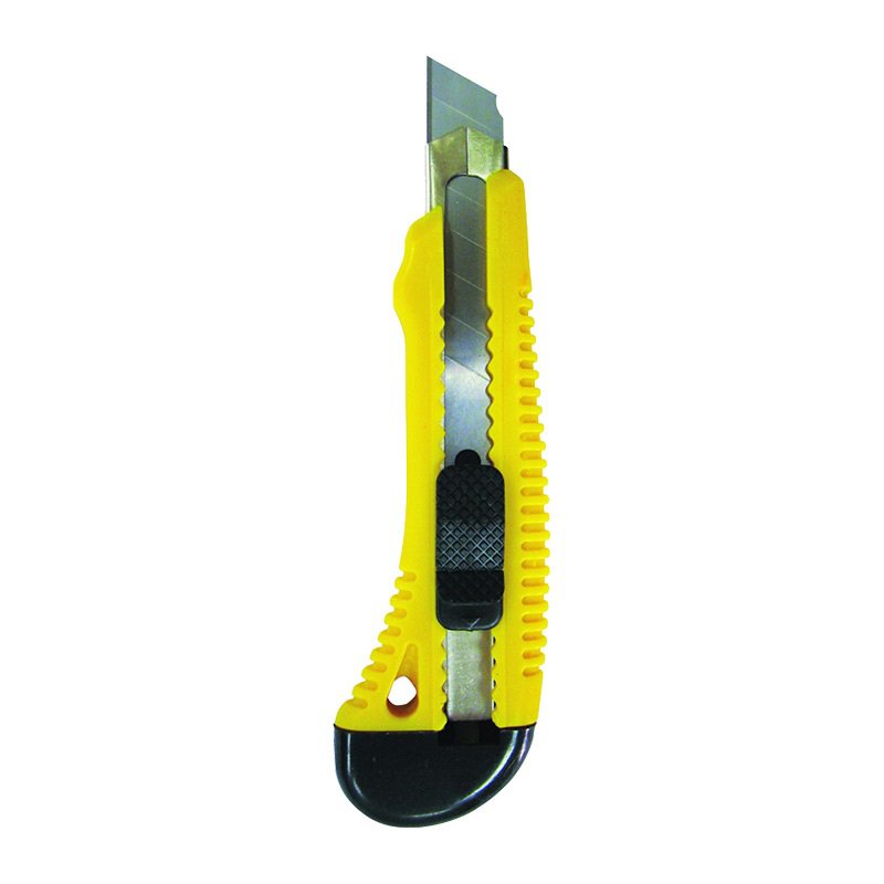 Предназначен для резки бумаги, картона, ткани и пластика. Пластмассовый корпус. Металлическая направляющая. Оснащен отламывающимся сегментированным лезвием.