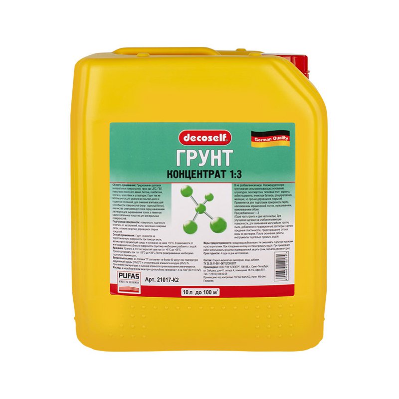 Грунт для внутренних и наружных работ. Предназначен для всех минеральных поверхностей, таких как: песочно-цементных, гипсо-волокнистых, известково-песочного камня, бетона, газобетона, кирпича, цементной плиты, шпатлёвок и штукатурок. В не разбавленном виде: рекомендуется при грунтовании сильновпитывающих оснований, штукатурок, плит из гипса и гипсокартона, кирпича, асбестоцемента, ячеистых бетонов, для укрепления слегка, мелящих, но прочно держащихся покрытий. При разбавлении 1:2 используется для улучшения адгезии на слабовпитывающие поверхности, для связывания мельчайших частиц пыли, добавления в традиционные растворы с целью придания пластичности, предотвращения образования трещин, предотвращения оттока воды из растворов. Расход: 1л на 10 м² (90-110 г/м²).