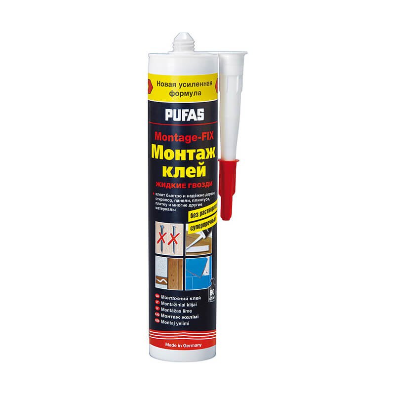 Клей для суперпрочного монтажа без шурупов и гвоздей внутри и снаружи помещений. На водной основе. Применим для внутренних и наружных работ на таких основаниях как дерево, бетон, камень, металл и т. п. на все основания, имеющие впитывающую способность. Клеит надёжно отделочные материалы из дерева, панели, плинтуса, декоративные плиты и профили из полистирола, дерева, ПВХ и т. п., а также облицовочную керамическую плитку, приспособления для прокладки кабеля и т. д. Непригоден для склеивания полиэтилена и пропилена. Расход: 300 – 500 г/м².