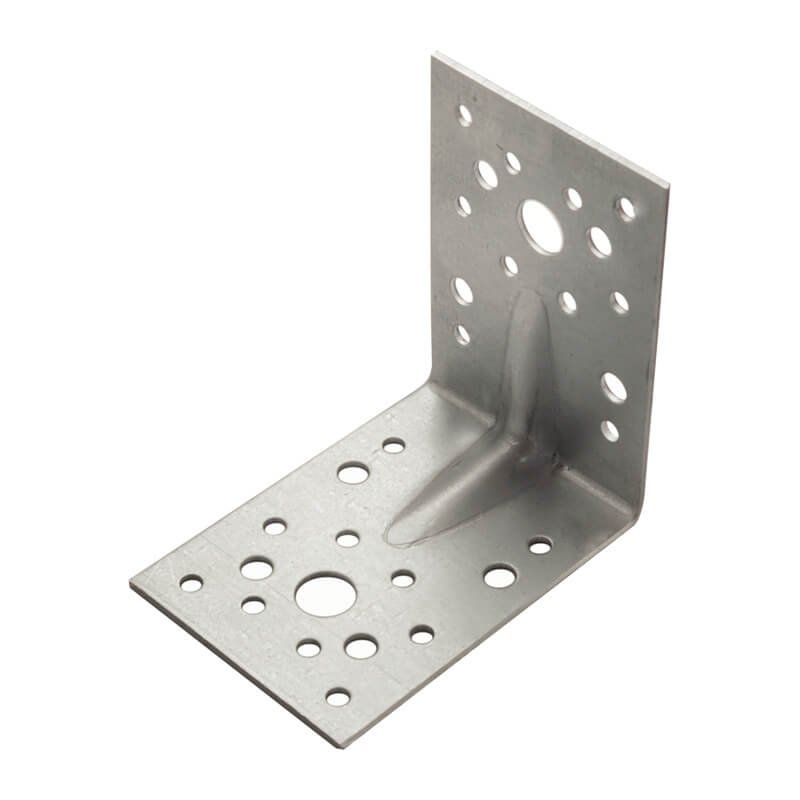 Предназначен для крепежа деревянных конструкций под углом 90 градусов. Имеет ребро жесткости для повышения прочности соединения. Изготовлен из оцинкованной стали толщиной 2 мм. Имеет отверстия под саморезы, гвозди, болты. Длина полки уголка 90 мм, ширина