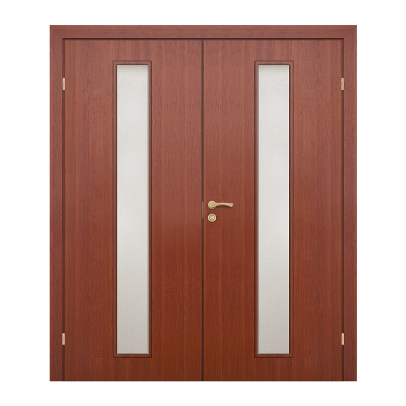 Полотно дверное, ответная часть, остекленное, без притвора, ламинированное. Каркас сделан из массива сосны и(или) МДФ. Сотовое картонное заполнение. Поверхность - плита ХДФ. Установлены ответная планка замка типа 0028, два врезных шпингалета, отфрезерованы посадочные места для крепления петель. Предназначено для комплектации двупольного дверного блока.