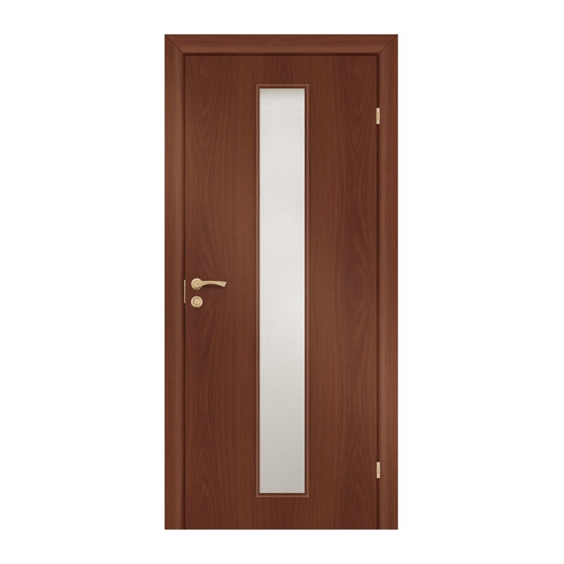 Дверное полотно: облегченной конструкции толщиной 35 мм, каркас из МДФ, заполнитель – сотовое картонное заполнение, поверхность– MDF плита, ламированная пленками производства Германия с финиш эффектом, цвет итальянский и миланский орех. Торцевая часть полотна для увеличения прочности покрыта кромочным пластиком под цвет полотна. В полотно установлен замок 2041 и выполнена фрезеровка под петли.