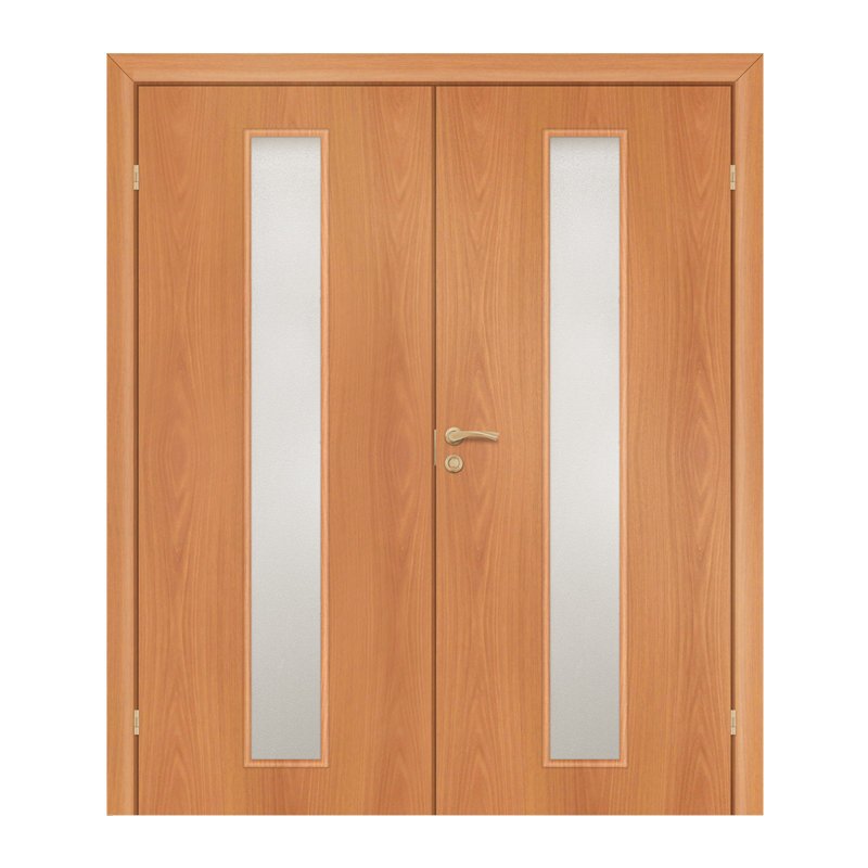 Полотно дверное, ответная часть, остекленное, без притвора, ламинированное. Каркас сделан из массива сосны и(или) МДФ. Сотовое картонное заполнение. Поверхность - плита ХДФ. Установлены ответная планка замка типа 0028, два врезных шпингалета, отфрезерованы посадочные места для крепления петель. Предназначена для комплектации двупольного дверного блока.