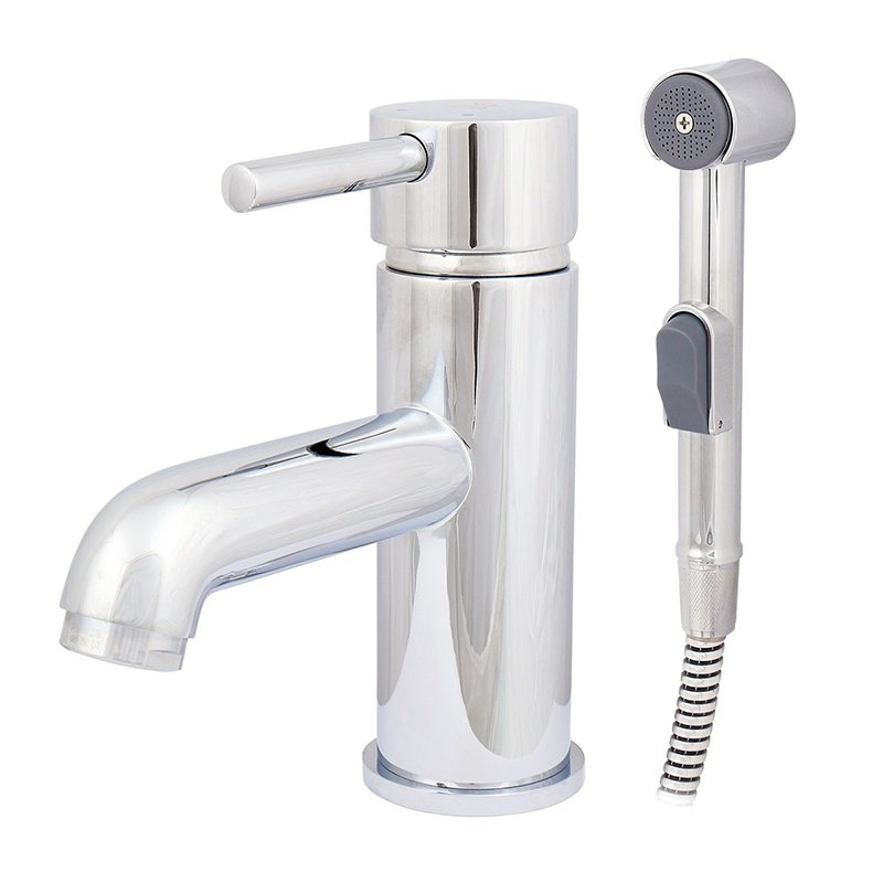 смеситель, шланг для душа ПВХ 1,5 м армированный алюминиевой спиралью и продольными нейлоновыми нитями, гигиенический душ (d= 33 мм), пластиковый держатель для лейки c комплектом крепежа, гибкая подводка, паспорт изделия.