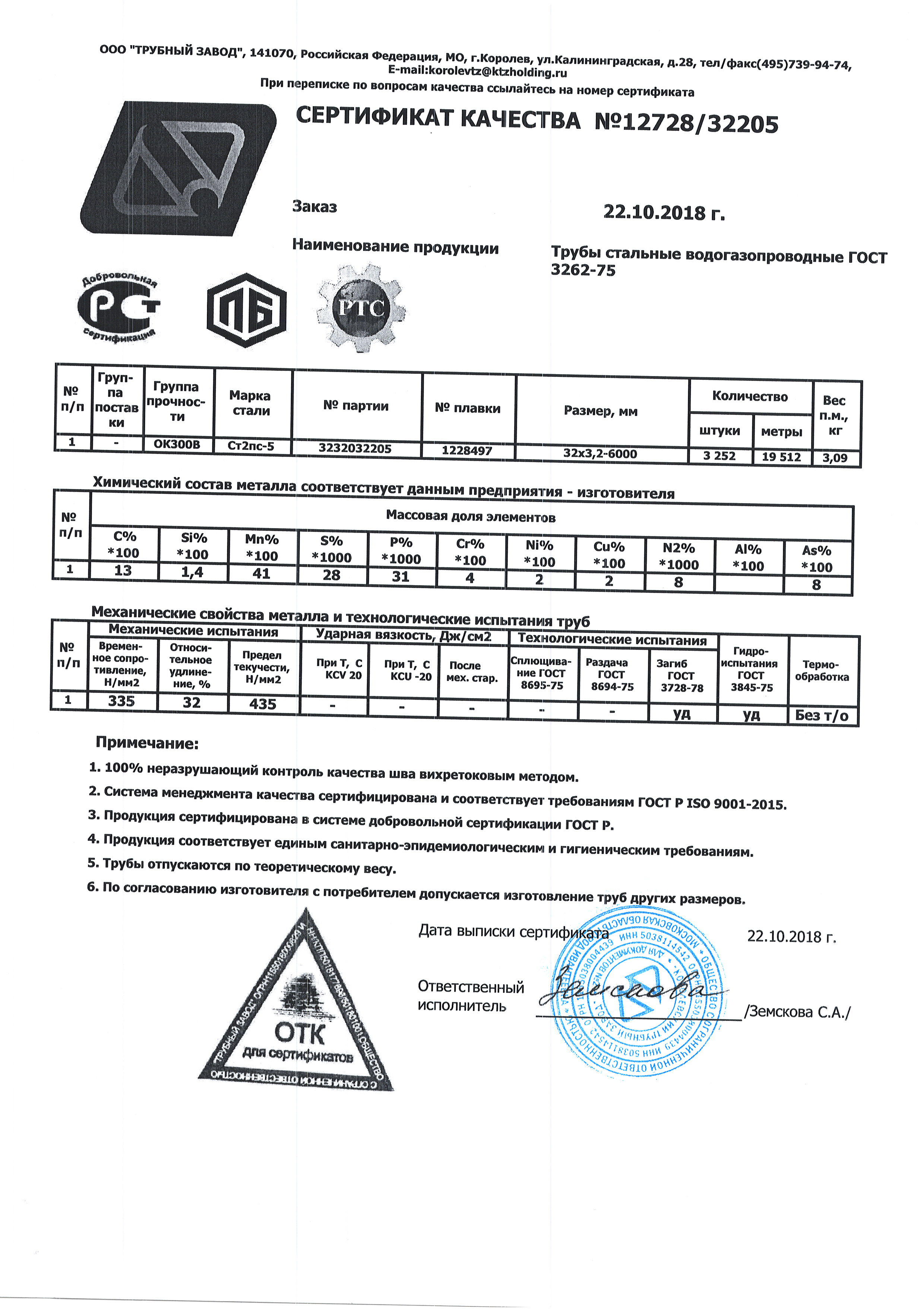 Допустимое отклонение в длине +/- 50мм, предельное отклонение толщины стенки от -25% до +12,5%