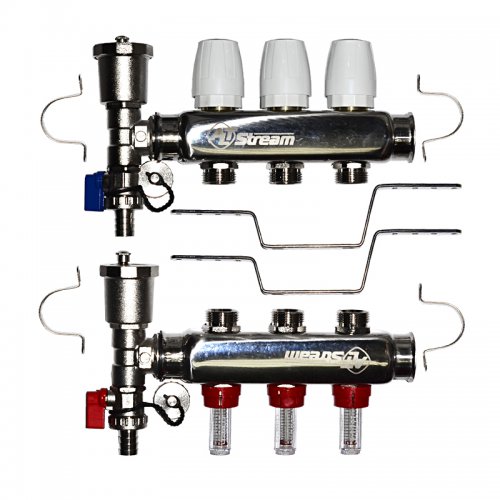 Группа коллект. 1"х3/4" 3вых. в сборе (расходомеры, дрен. кран, авт. возд. отв) 90гр, 8бар, нерж. сталь