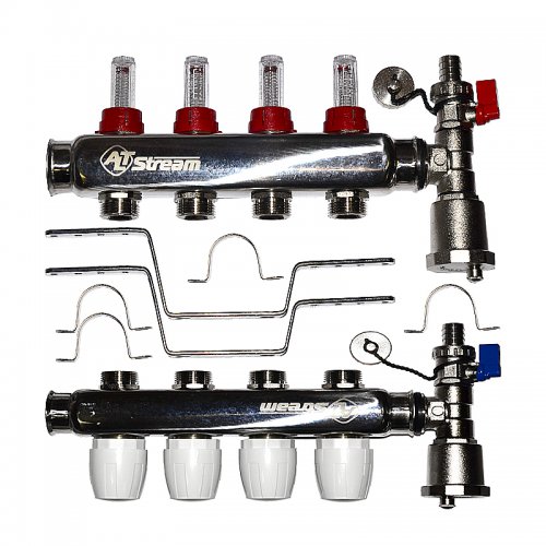 Группа коллект. 1"х3/4" 4вых. в сборе (расходомеры, дрен. кран, авт. возд. отв) 90гр, 8бар, нерж. сталь