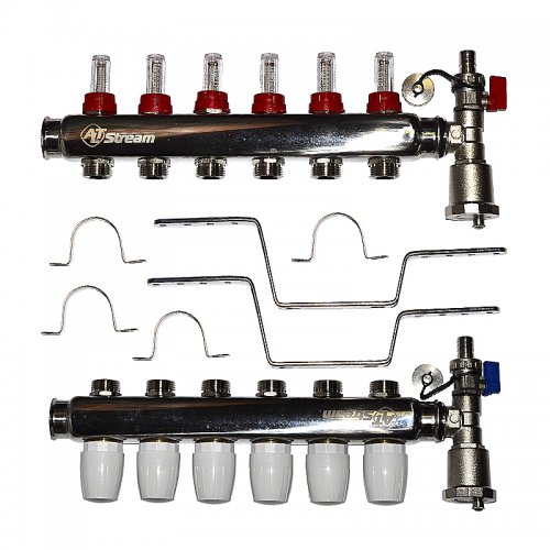 Группа коллект. 1"х3/4" 6вых. в сборе (расходомеры, дрен. кран, авт. возд. отв) 90гр, 8бар, нерж. сталь